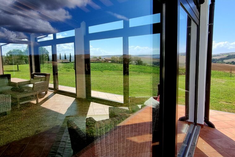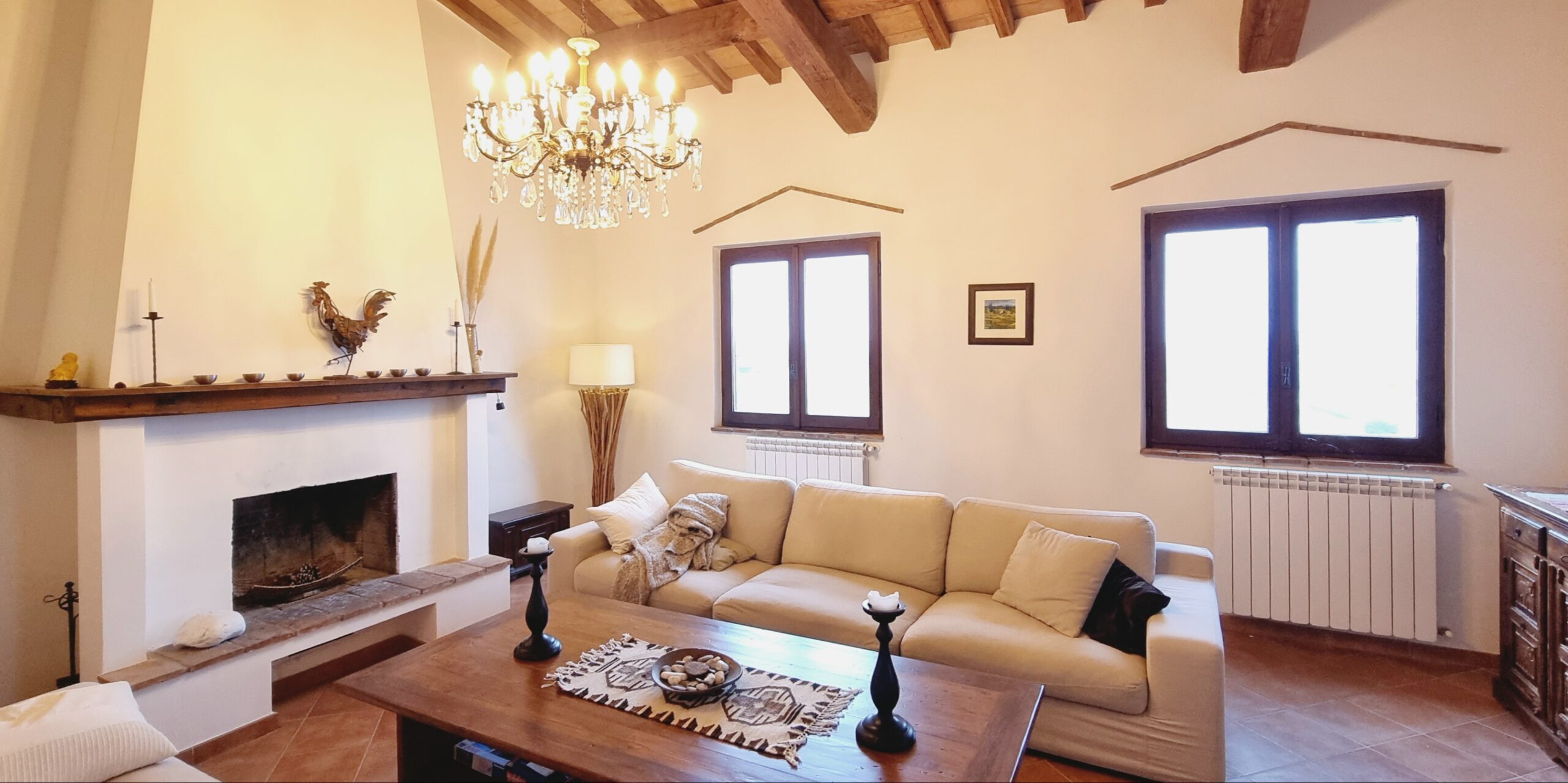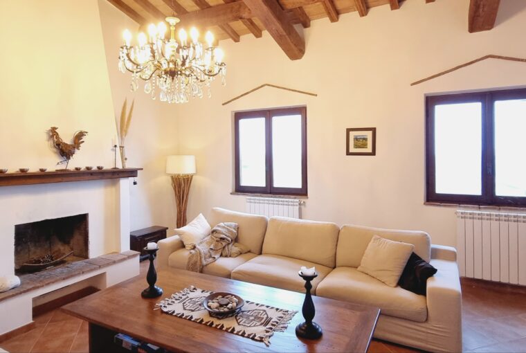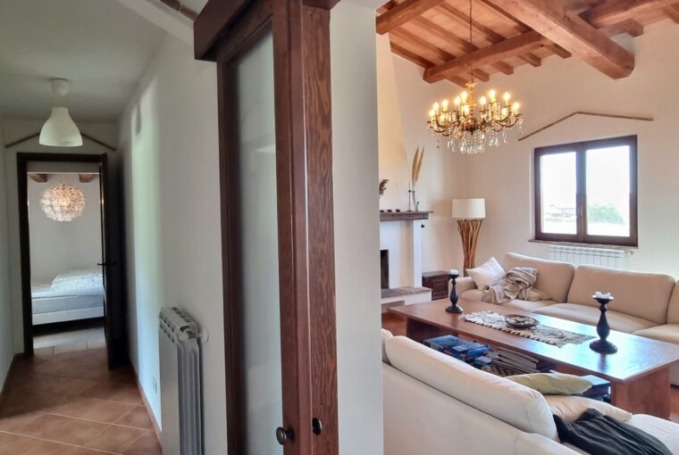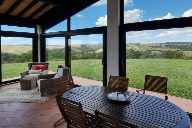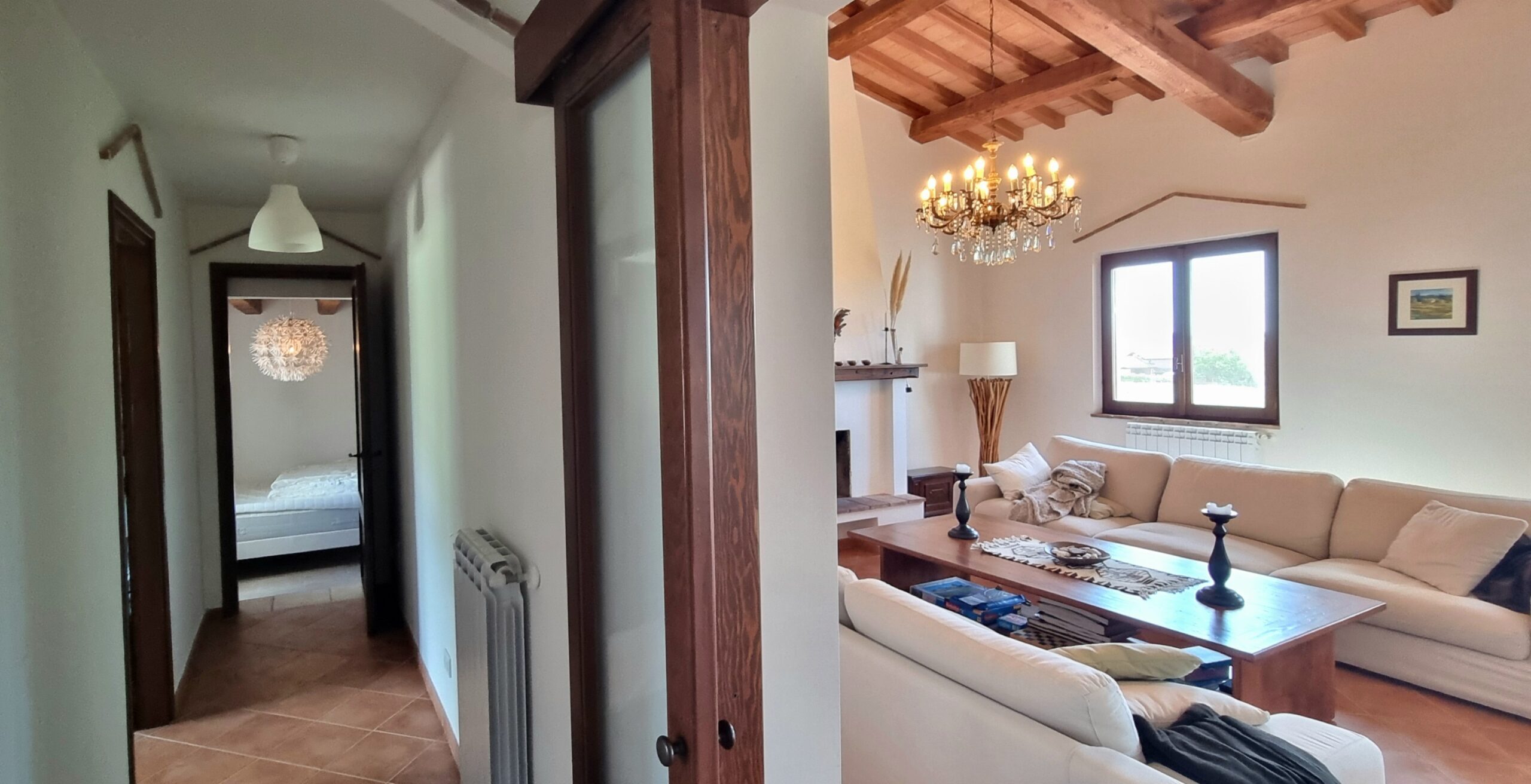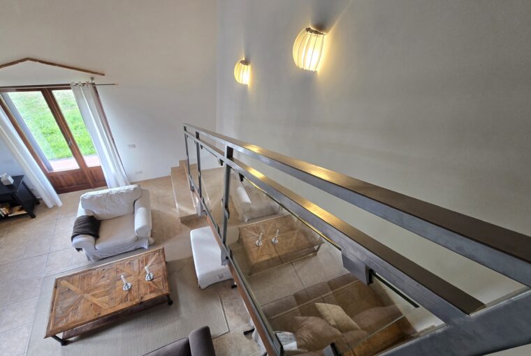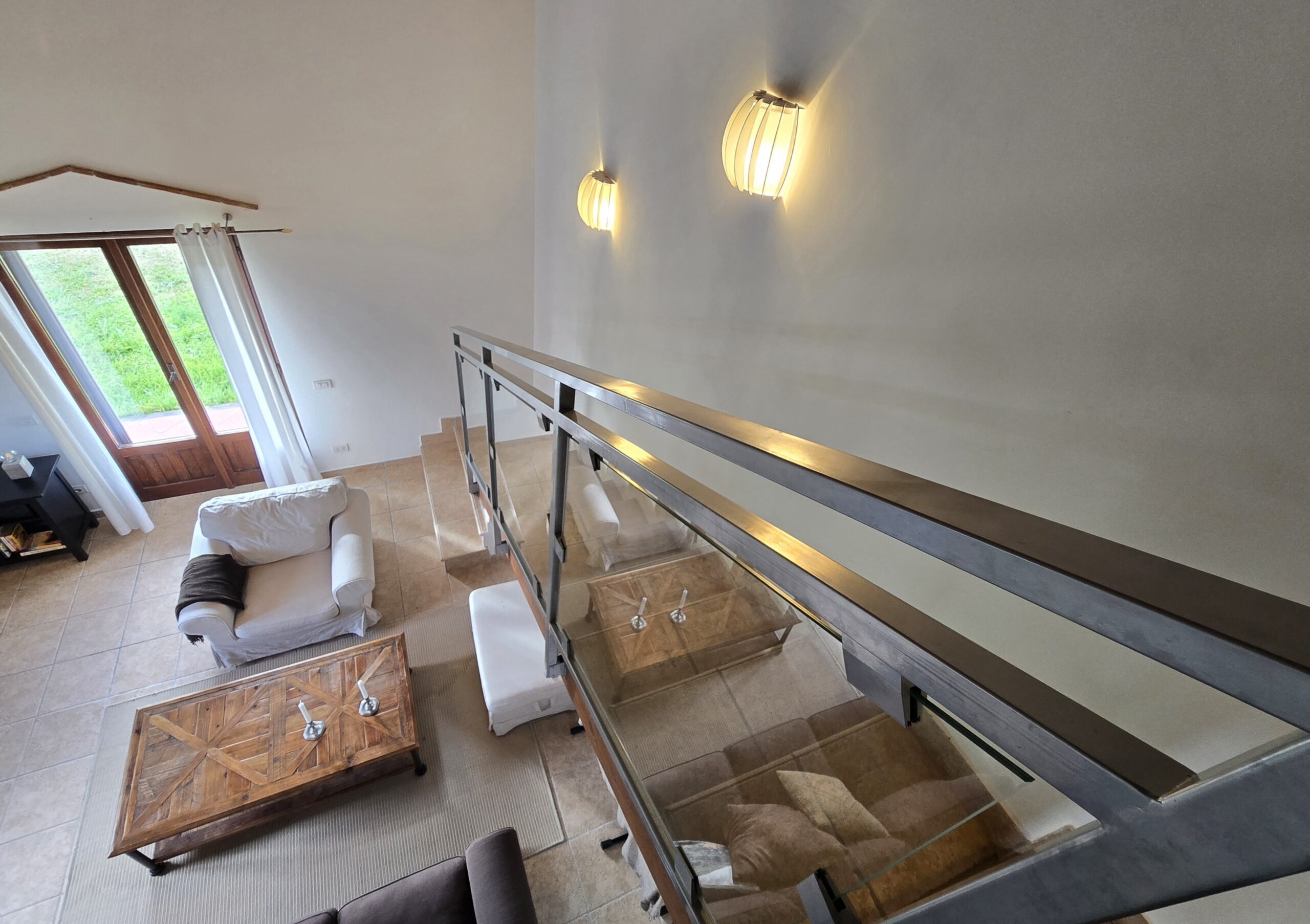 Entriamo nell’abitazione con ingresso sul grande soggiorno e troviamo una gradevole cucina a vista, in un ambiente che dona una sensazione di spazio e libertà. Dal soggiorno si accede ad una preziosa veranda chiusa a vetri (circa 35 m²), da cui godersi la vista sulle colline in qualsiasi stagione.